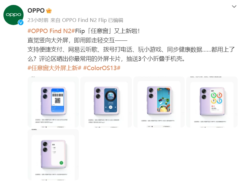 4 月 13 日消息,OPPO 官方微博近日發(fā)文表示,OPPO Find N2 Flip 手機任意窗功能更新,新增音樂卡片、健康數(shù)據(jù)顯示等功能。