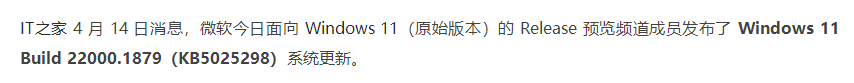 4 月 14 日消息,微軟今日面向 Windows 11(原始版本)的 Release 預覽頻道成員發布了 Windows 11 Build 22000.1879(KB5025298)系統更新。