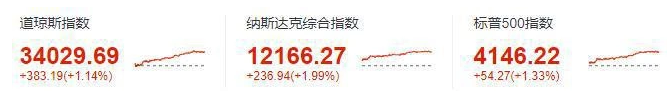 道瓊斯指數收于 34029.69 點,上漲 383.19 點,漲幅 1.14%;標準普爾 500 指數收于 4146.22 點,漲幅 1.33%;納斯達克指數收于 12166.27 點,漲幅 1.99%。道瓊斯指數和標普 500 指數均創下 2 月中旬以來的最高收盤點位。