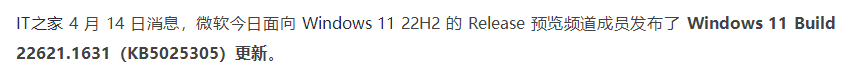 4 月 14 日消息,微軟今日面向 Windows 11 22H2 的 Release 預(yù)覽頻道成員發(fā)布了 Windows 11 Build 22621.1631(KB5025305)更新。