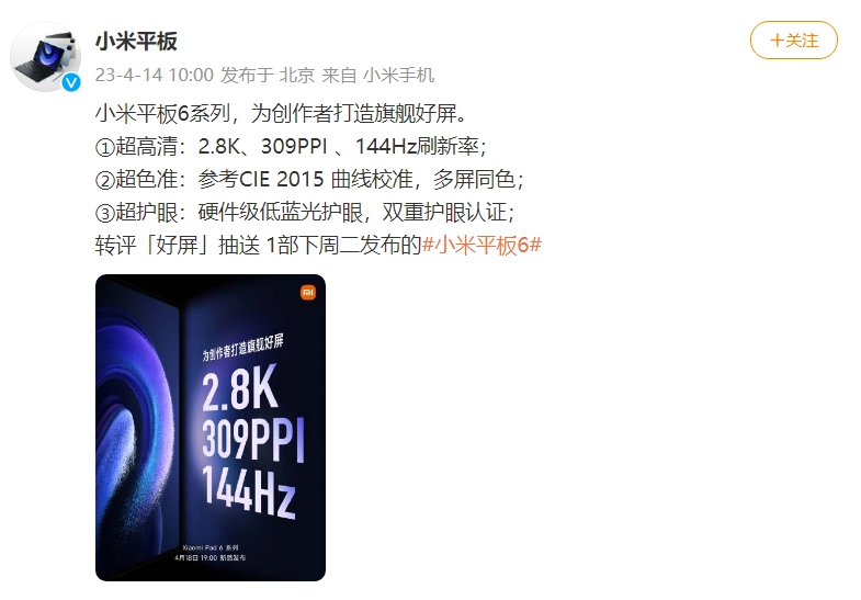 今日,小米平板官方發(fā)文預熱小米 Pad 6 系列平板電腦,宣布其將搭載 2.8K 顯示屏,并支持 144Hz 刷新率。除此之外,這款平板電腦所采用的屏幕還參考了 CIE 2015 曲線校準,屏幕顯示色差更小。