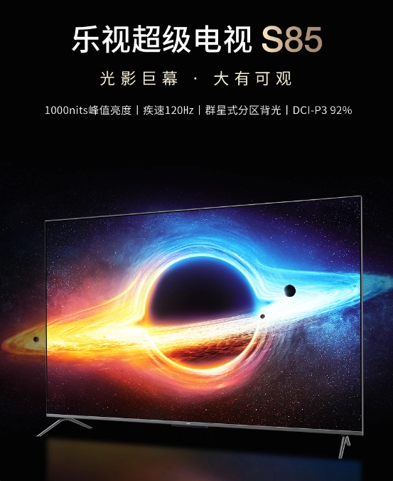 樂視超級電視 S85 采用 85 英寸 4K 120Hz MEMC 高刷屏,支持最高 120 個背光分區,1000 尼特峰值亮度,以及 92% DCI-P3 色域,搭載極色炫彩畫質引擎 Pro,采用鋁合金機身。