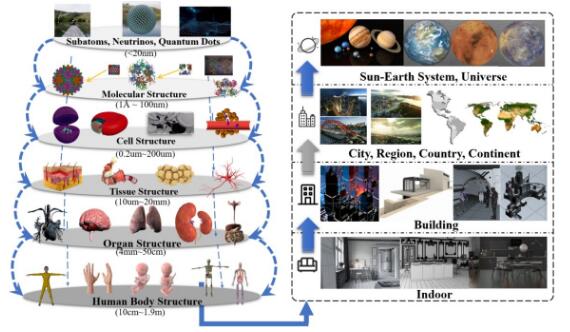 在元宇宙的大背景下,數(shù)字孿生應(yīng)該實(shí)現(xiàn)尺度上的雙向擴(kuò)展。一方面,需要在宏觀尺度實(shí)現(xiàn)全宇宙的數(shù)字孿生。另一方面,也應(yīng)實(shí)現(xiàn)微觀尺度的分子的數(shù)字孿生。跨學(xué)科、跨領(lǐng)域的采集設(shè)備為數(shù)字孿生系統(tǒng)的信息采集提供了廣泛的來源。從不同精度顯微鏡下的亞原子、中微子、量子點(diǎn)到人體分子、細(xì)胞、組織、器官和結(jié)構(gòu),到全景相機(jī)下的城市街道和地域面貌,到地球觀測(cè)衛(wèi)星下的地球,再到望遠(yuǎn)鏡下的恒星行星、太陽(yáng)系和太空。這是一個(gè)從微觀到宏觀的不同的尺度漸變過程。