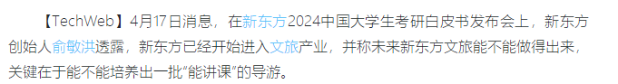 4月17日消息,在新東方2024中國大學生考研白皮書發布會上,新東方創始人俞敏洪透露,新東方已經開始進入文旅產業,并稱未來新東方文旅能不能做得出來,關鍵在于能不能培養出一批“能講課”的導游。