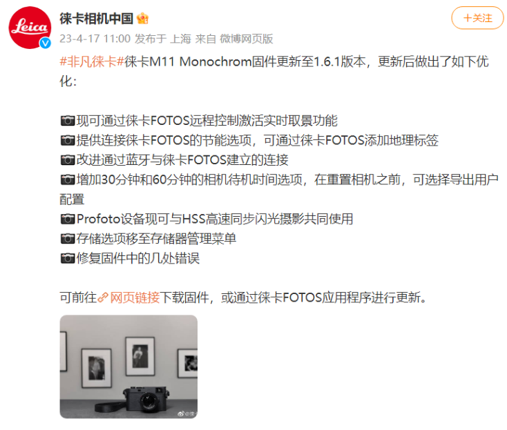 4 月 17 日消息,徠卡中國官方微博今日發(fā)文宣布,徠卡 M11 Monochrom 相機(jī)固件升級至 1.6.1 版本,此次更新內(nèi)容包括新增徠卡 FOTOS 遠(yuǎn)程控制激活實(shí)時取景功能、存儲選項(xiàng)移至存儲器管理菜單等。