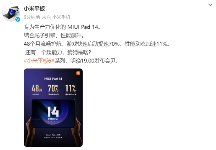 今日,小米官方發文預熱小米 Pad 6 系列平板電腦,宣布新款平板電腦將搭載專為生產力優化的 MIUI Pad 14.輔以光子引擎整機性能表現強悍。此外,小米官方表示在 MIUI Pad 14 的加持下,小米 Pad 6 系列平板電腦可在 48 個月內保持流暢使用,游戲啟動提速 70%、性能動態加速 11%。