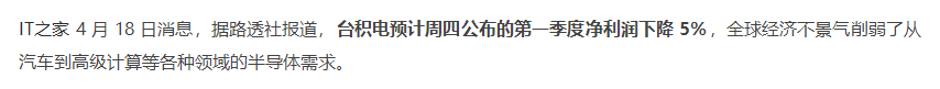4 月 18 日消息,據路透社報道,臺積電預計周四公布的第一季度凈利潤下降 5%,全球經濟不景氣削弱了從汽車到高級計算等各種領域的半導體需求。