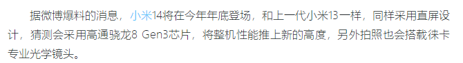 4月23日消息:據(jù)微博爆料的消息,小米14將在今年年底登場,和上一代小米13一樣,同樣采用直屏設計,猜測會采用高通驍龍8 Gen3芯片,將整機性能推上新的高度,另外拍照也會搭載徠卡專業(yè)光學鏡頭。
