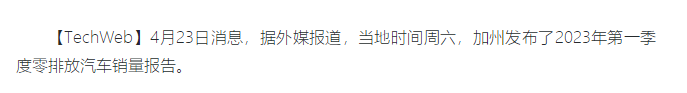 4月23日消息,據外媒報道,當地時間周六,加州發布了2023年第一季度零排放汽車銷量報告。