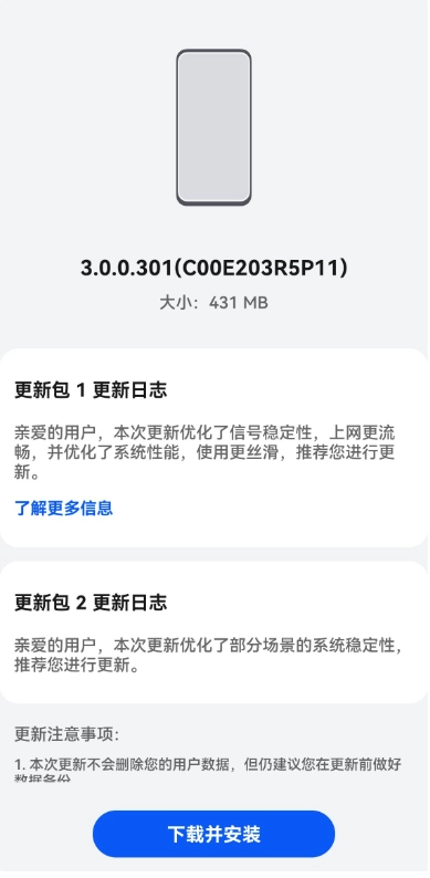 4 月 23 日消息,據IT之家網友反饋,華為 Mate 50 系列推送 HarmonyOS 3 新版本更新,版本號為 3.0.0.301(C00E203R5P11),大小 431MB,優化了信號、系統穩定性等。