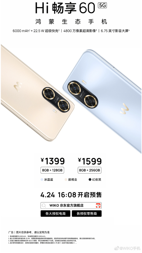 4 月 24 日消息 WIKO 今天下午召開新品發布會,正式發布了 5G 鴻蒙生態手機 ——Hi 暢享 60 5G。新機今日開啟預售,1399 元起!