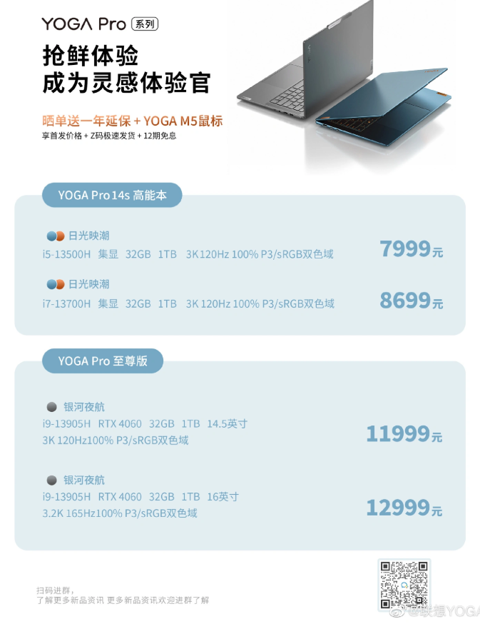 4 月 24 日消息,聯想 Yoga Pro 系列價格正式公布,今日開啟首發,曬單送一年延保,還送 YOGA 鼠標。