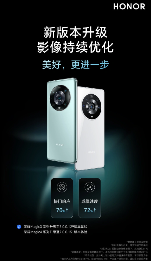 4 月 24 日消息,榮耀官方現在帶來了對榮耀 Magic3 和 Magic4 系列手機的影像優化升級,快門響應速度提升 70%,成像速度提升 72%,其中榮耀 Magic3 系列升級至 7.0.0.129 版本體驗,榮耀 Magic4 系列升級至 7.0.0.151 版本體驗。(快門響應:拍攝動態物體場景下,抓拍快門時間。成像速度:拍攝動態物體場景下,點擊拍照按鈕到左下角出現縮略圖顯示時長。)