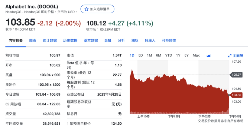 Alphabet A 類股 (GOOGL) 周二在納斯達克交易所的開盤價為 105.82 美元。截至周二收盤,Alphabet 股價下跌 2.12 美元,報收于 103.85 美元,跌幅為 2.00%。截至美國東部時間周二 17:22 分 (北京時間周三 5:22 分),Alphabet 股價上漲 4.27 美元至 108.12 美元,漲幅為 4.11%。過去 52 周,Alphabet 股價最高為 122.85 美元,最低為 83.34 美元。
