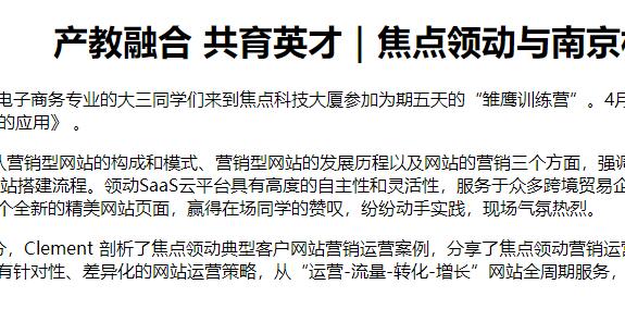 校企合作可以幫助學生更好地了解企業實際需求和行業動態,提高學生的實踐能力和就業競爭力。課程的最后,Clement著重分享了焦點領動DAAS數智化經營理念。“伴隨外貿網站數字化、智能化的推進,過去零散的賦能服務已經不能滿足企業的需求,因此企業需要更加系統化的能力和整體解決方案,“Clement分享到,“‘領動3.0‘作為焦點領動打造的云建站營銷方案,其底層邏輯之一,便是賦能跨境貿易企業實現數字化到數據智能化的轉變。“