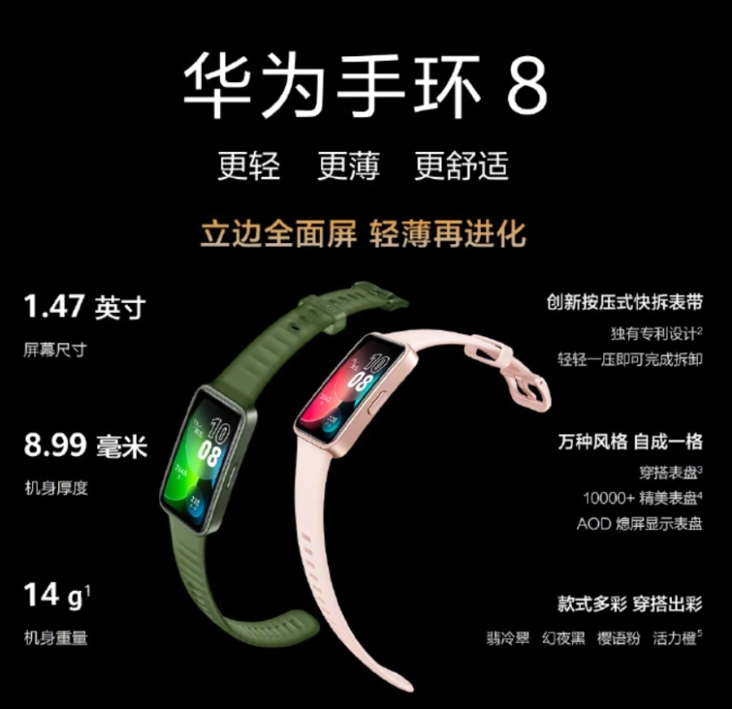 華為手環(huán) 8 號稱是華為迄今為止最輕最薄的大屏智能手環(huán),機(jī)身(表體)重 14g,重量減少 12.5%;厚度 8.99mm,厚度減少 10%。華為手環(huán) 8 采用輕薄立邊全面屏設(shè)計,搭載 1.47 英寸大屏。