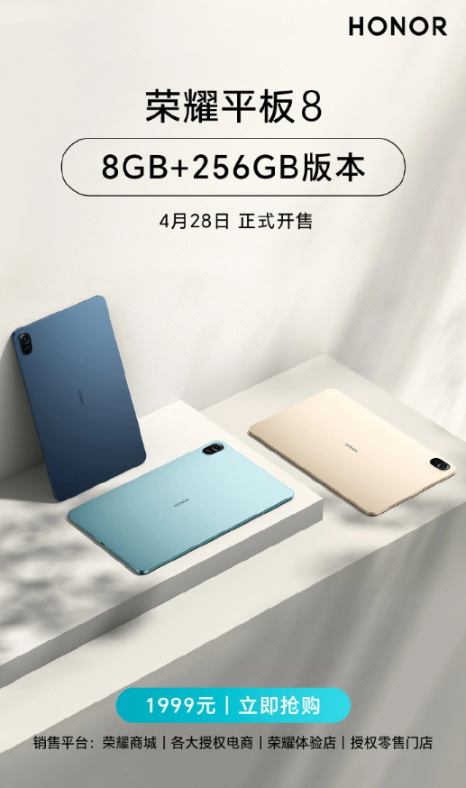 4 月 27 日消息,榮耀智慧生活官方微博今日發文表示,將推出 8GB+256GB 版本榮耀平板 8.定價 1999 元,4 月 28 日正式開售。