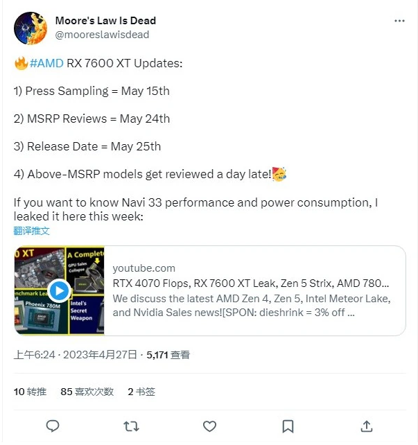 4 月 27 日消息,消息源 Moore's Law is Dead 發(fā)布推文,表示 AMD 即將于 2023 年 5 月 25 日發(fā)布 RX 7600 XT 顯卡,相關(guān)媒體評(píng)論將會(huì)在 5 月 15 日解禁。