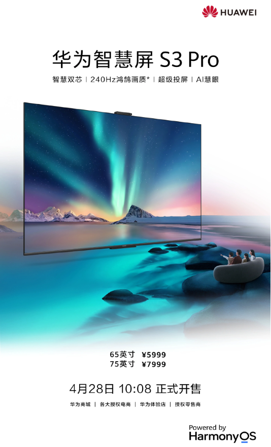 4 月 28 日消息,華為宣布,全新華為智慧屏 S3 Pro 帶來更豐富的全場景智慧體驗。4 月 28 日 10:08 正式開售,首銷期間優惠 500 元。