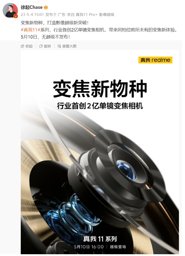 5 月 4 日消息,realme 11 系列新品手機官宣將于 5 月 10 日發布,該系列預計包括三款設備:realme 11 標準版、realme 11 Pro、realme 11 Pro+,將主打影像旗艦。