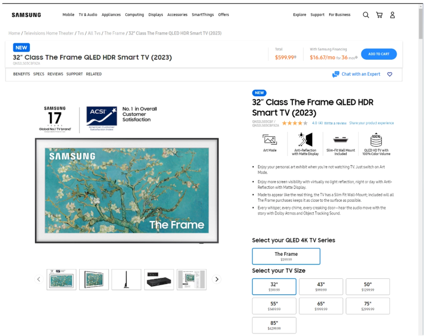 5 月 4 日消息,在 CES 2023 上,三星推出了新的電視系列,包括更新的 Neo QLED 和 QD-OLED 型號,但未出行 2023 款 The Frame TV。現(xiàn)在,三星首先更新了 The Frame TV 2023 款系列中的 32 英寸型號。