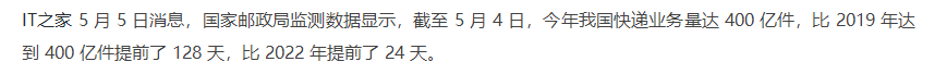 5 月 5 日消息,國家郵政局監測數據顯示,截至 5 月 4 日,今年我國快遞業務量達 400 億件,比 2019 年達到 400 億件提前了 128 天,比 2022 年提前了 24 天。