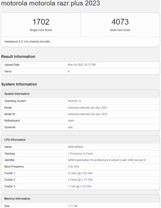 5 月 5 日消息,據(jù) gsmarena 報(bào)道,moto 旗下新機(jī)“motorola razr plus 2023”近日出現(xiàn)在了 Geekbench 跑分網(wǎng)站之上。從其型號(hào)名不難看出,這款手機(jī)預(yù)計(jì)為 moto 即將推出的豎折折疊屏手機(jī)。