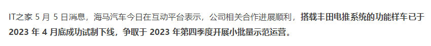 5 月 5 日消息,海馬汽車今日在互動平臺表示,公司相關合作進展順利,搭載豐田電推系統的功能樣車已于 2023 年 4 月底成功試制下線,爭取于 2023 年第四季度開展小批量示范運營。