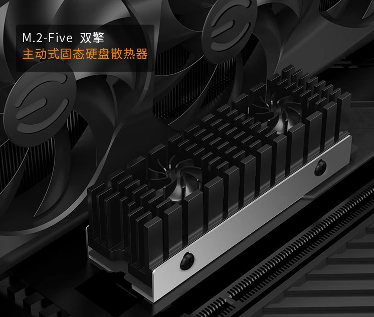 現(xiàn)在,國(guó)內(nèi)散熱器廠商九鯊?fù)瞥鲂驴?M.2-Five 雙擎散熱器,內(nèi)置兩個(gè)小風(fēng)扇散熱。