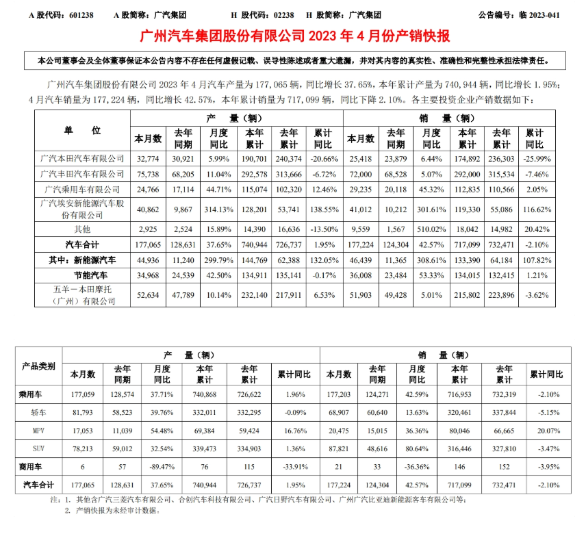 5 月 6 日消息,廣汽集團(tuán)于昨日公布了 2023 年 4 月產(chǎn)銷快報(bào),4 月新能源汽車銷量 46439 輛,同比增長 308.61%;本年累計(jì)新能源汽車銷量 133390 輛,同比增長 107.82%。