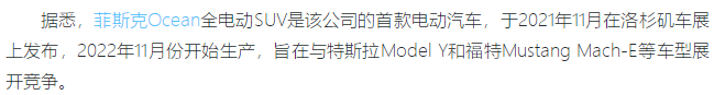 據悉,菲斯克Ocean全電動SUV是該公司的首款電動汽車,于2021年11月在洛杉磯車展上發布,2022年11月份開始生產,旨在與特斯拉Model Y和福特Mustang Mach-E等車型展開競爭。